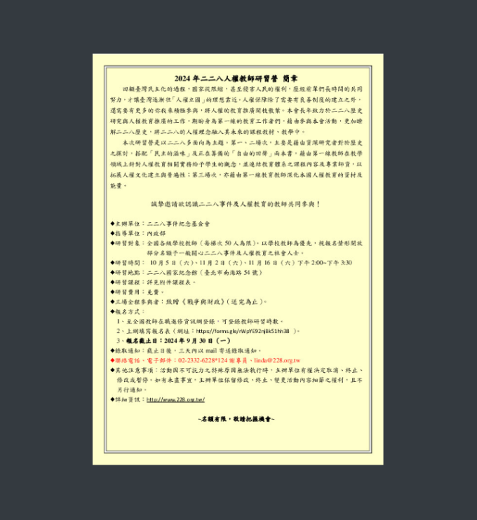 2024年二二八人權教師研習營將於今年10月5日(星期六)、11月2日(星期六)及11月16日(星期六)於二二八國家紀念館舉辦「2024年人權教師研習營」活動