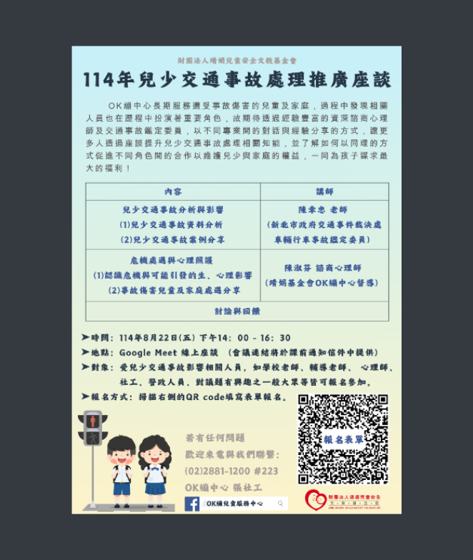 主旨:靖娟兒童安全文教基金會OK繃兒童服務中心將於8月22日 辦理「114年兒少交通事故處理推廣座談」,請踴躍 派員參加,請查照。