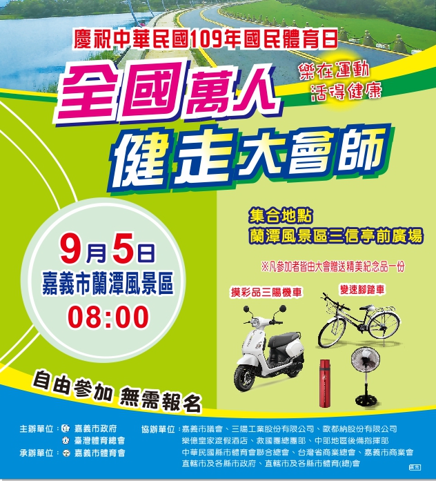 預定於109年9月5日(星期六)上午8時於嘉義市蘭潭風景區舉辦 集合地點:蘭潭風景區三信亭前廣場 凡參加者皆由大會贈送精美紀念品 現場有三陽機車六部、變速腳踏車百台等及百項獎品提供摸彩唷!! 歡迎大家相招一起來 自由參與 無需報名。
