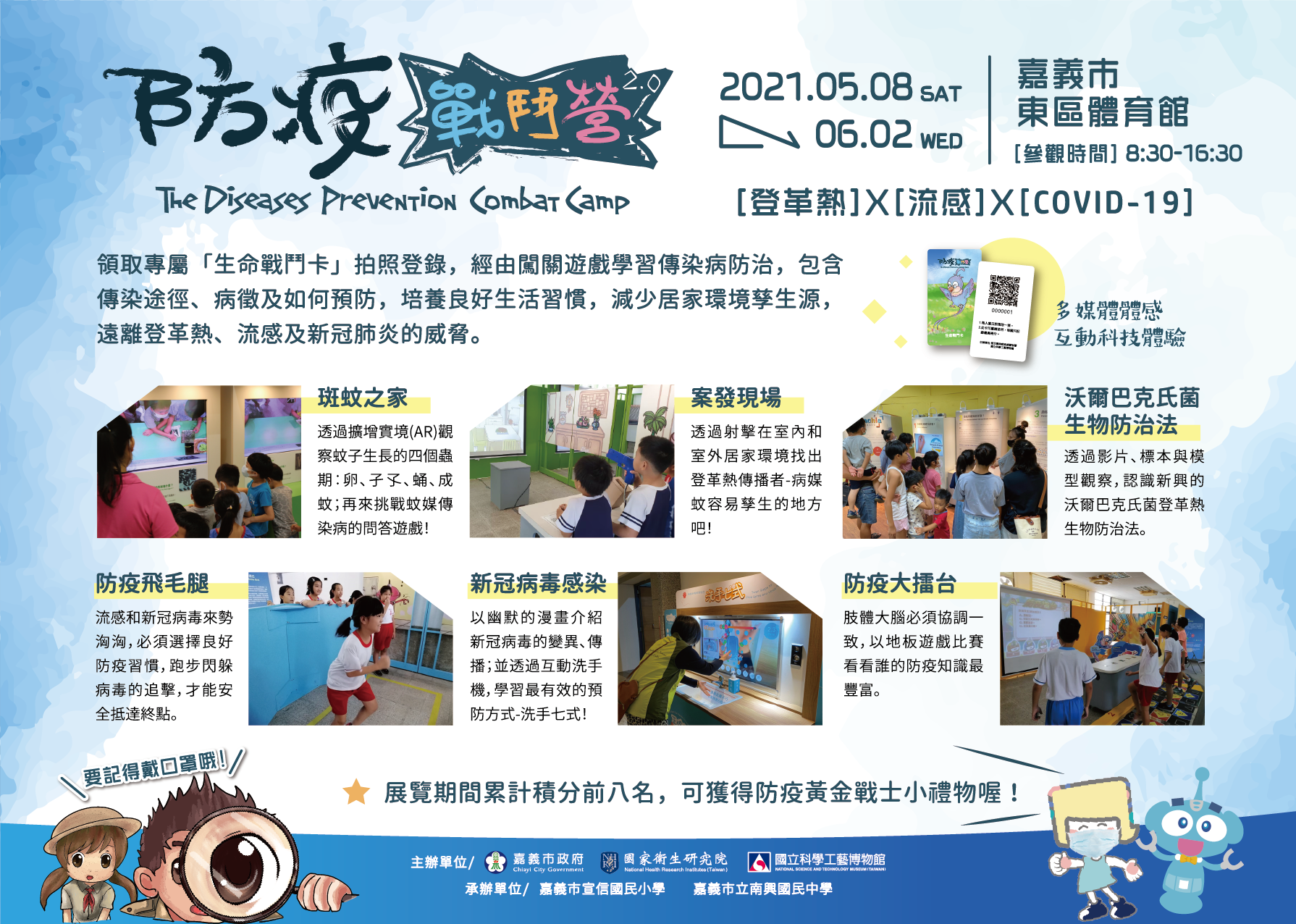 二、 特展110年5月8日至6月2日於嘉義市東區體育館展出,以高互動體驗搭配遊戲闖關,及寓教於樂的多媒體互動科技展示手法,介紹登革熱、流感及新冠肺炎等傳染病,請鼓勵學生及家長踴躍觀展。