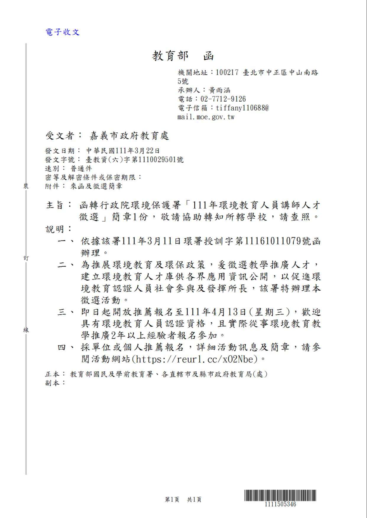一、 依據教育部111年3月22日臺教資(六)字第1110029501號函辦理。