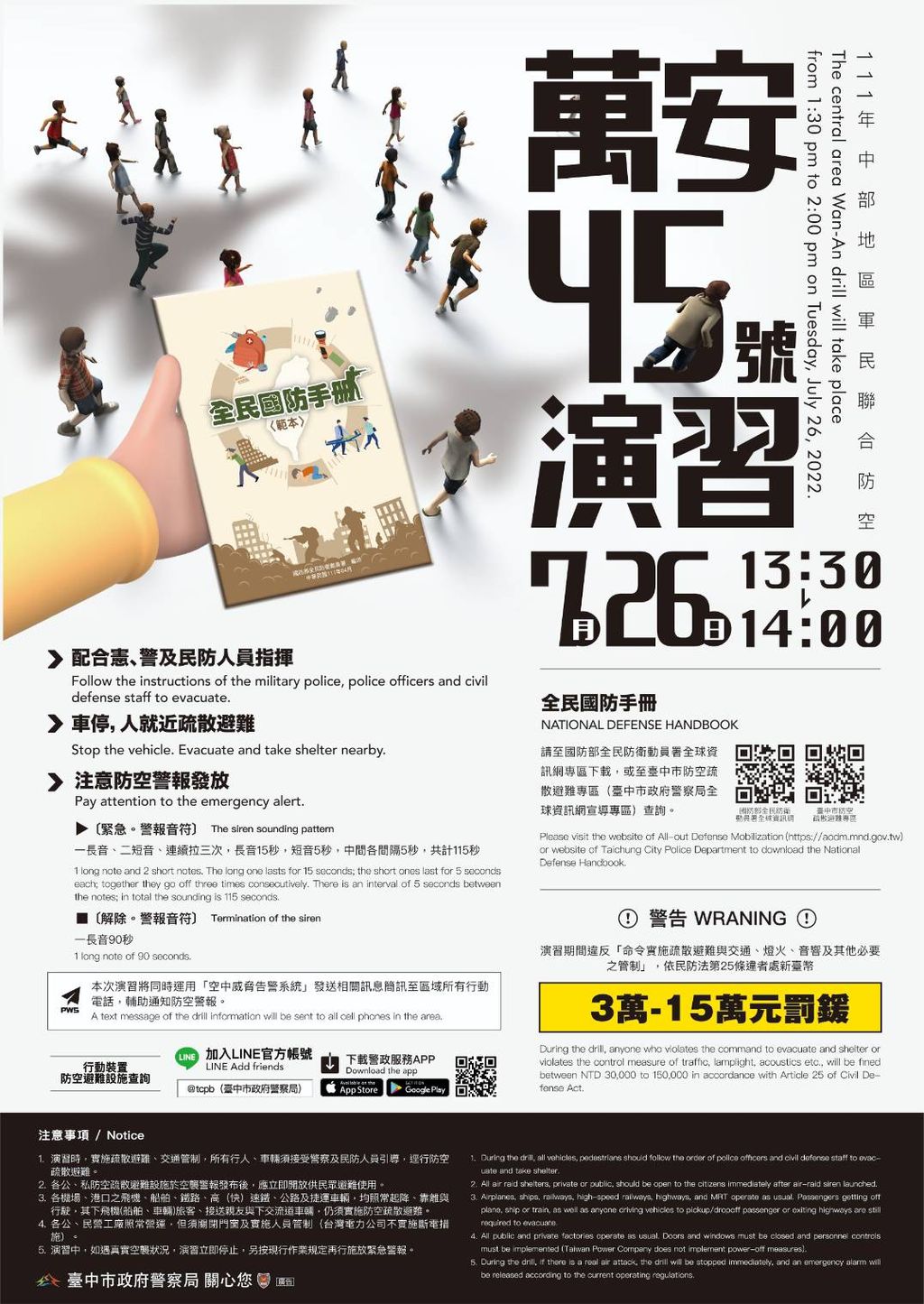 二、各機場、港口之飛機、船舶、鐵路、高(快)速鐵、公路及捷運車輛,均照常起降、靠離與行駛,其下飛機(船舶、車輛)旅客、接送親友與下交流道車輛,仍須實施防空疏散避難。演習期間違反「疏散避難與交通、燈火、音響及其他必要之管制」,依民防法第25條處新臺幣3萬元以上15萬元以下罰鍰。
