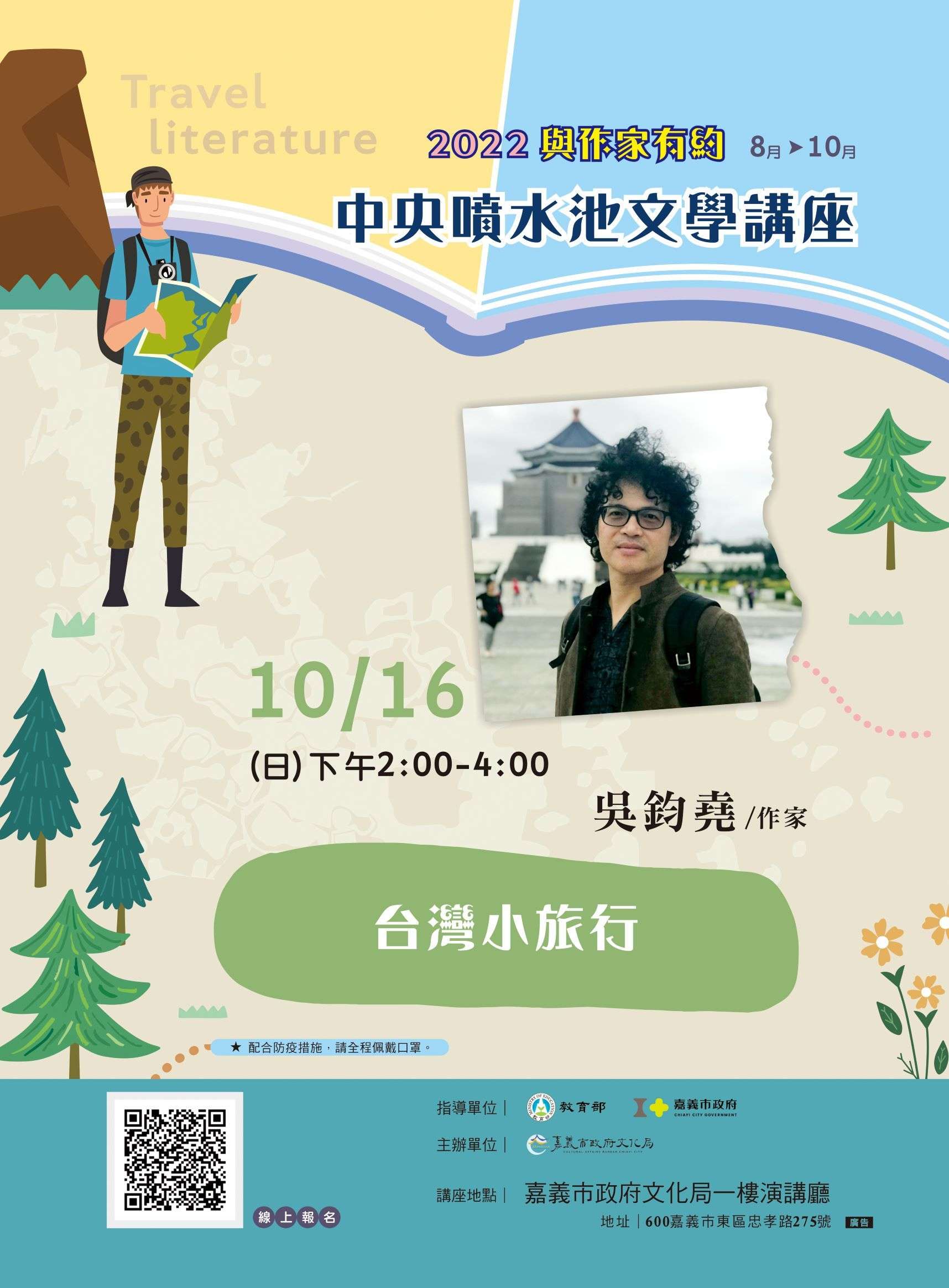 嘉義市文化局辦理2022年與作家有約-中央噴水池文學講座」,10月份活動海報如附件,歡迎踴躍報名參加。