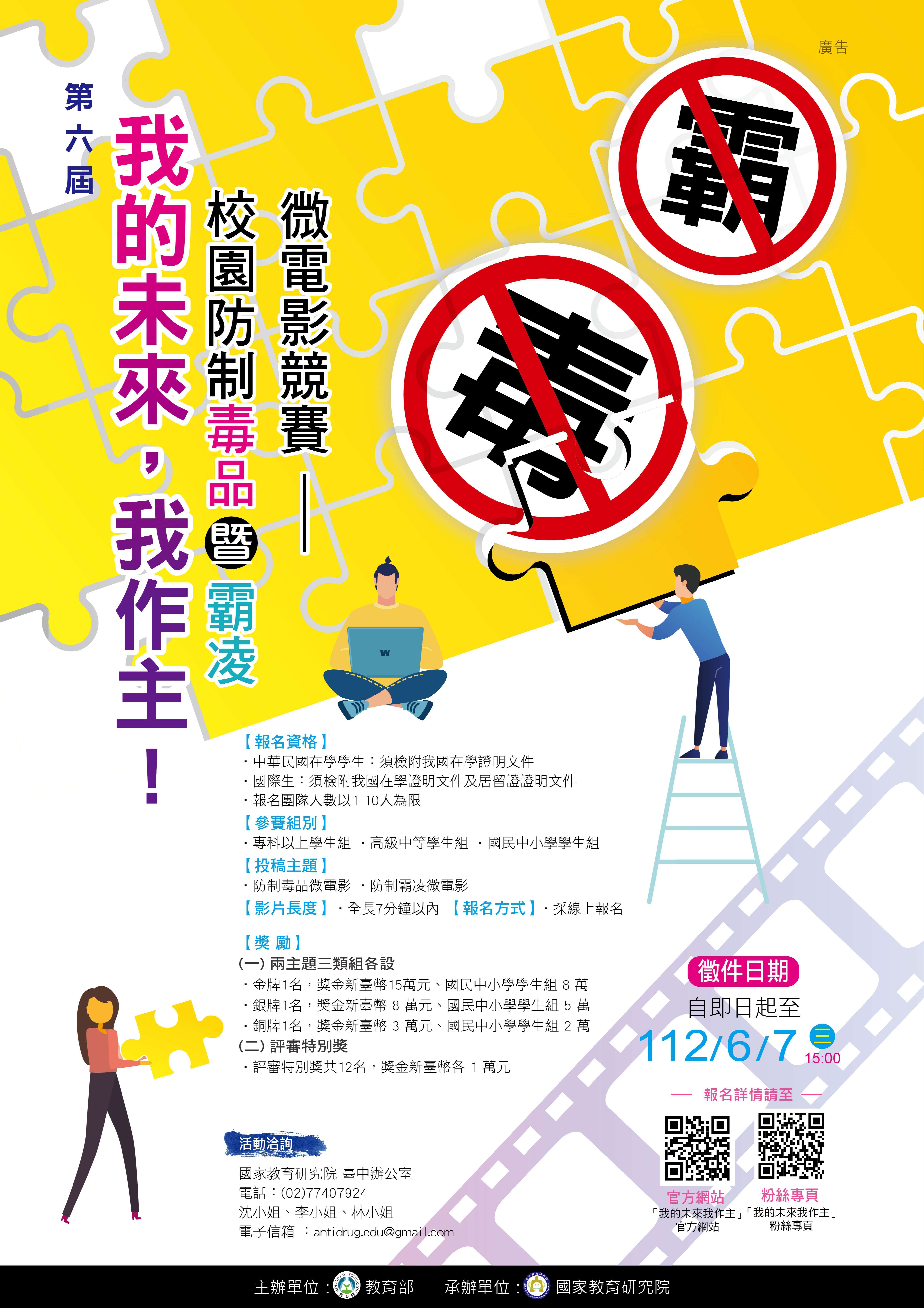 教育部第六屆「我的未來我做主」校園防制毒品暨霸凌微電影競賽活動徵件及宣傳海報各1份(如附件),請學生踴躍報名參加。