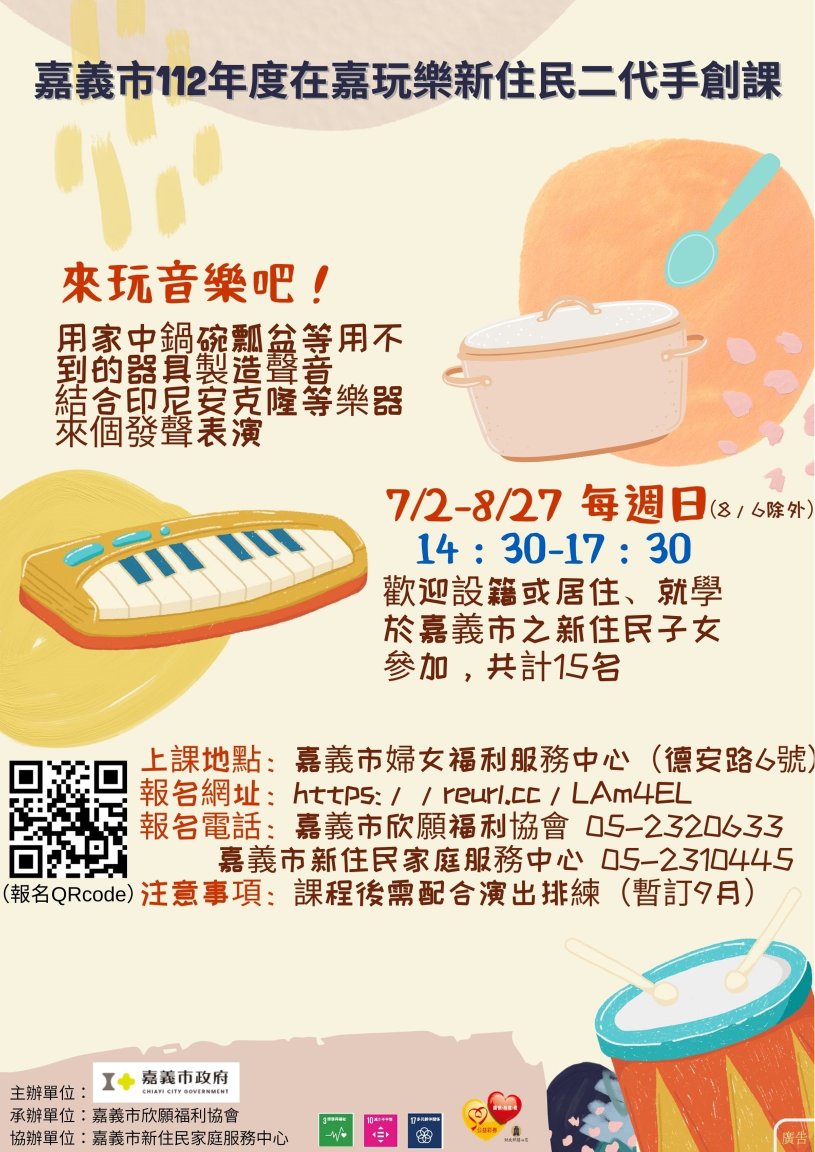 (二)嘉義市112年度在嘉玩樂新住民二代手創課:活動課程訂於112年7月至8月,假嘉義市婦女福利服務中心辦理,因應108課綱素養學習,推廣藝術生活化之多元文化學習方式,結合各國打擊樂器讓新二代學習相互合作及尊重,深根創新思維。