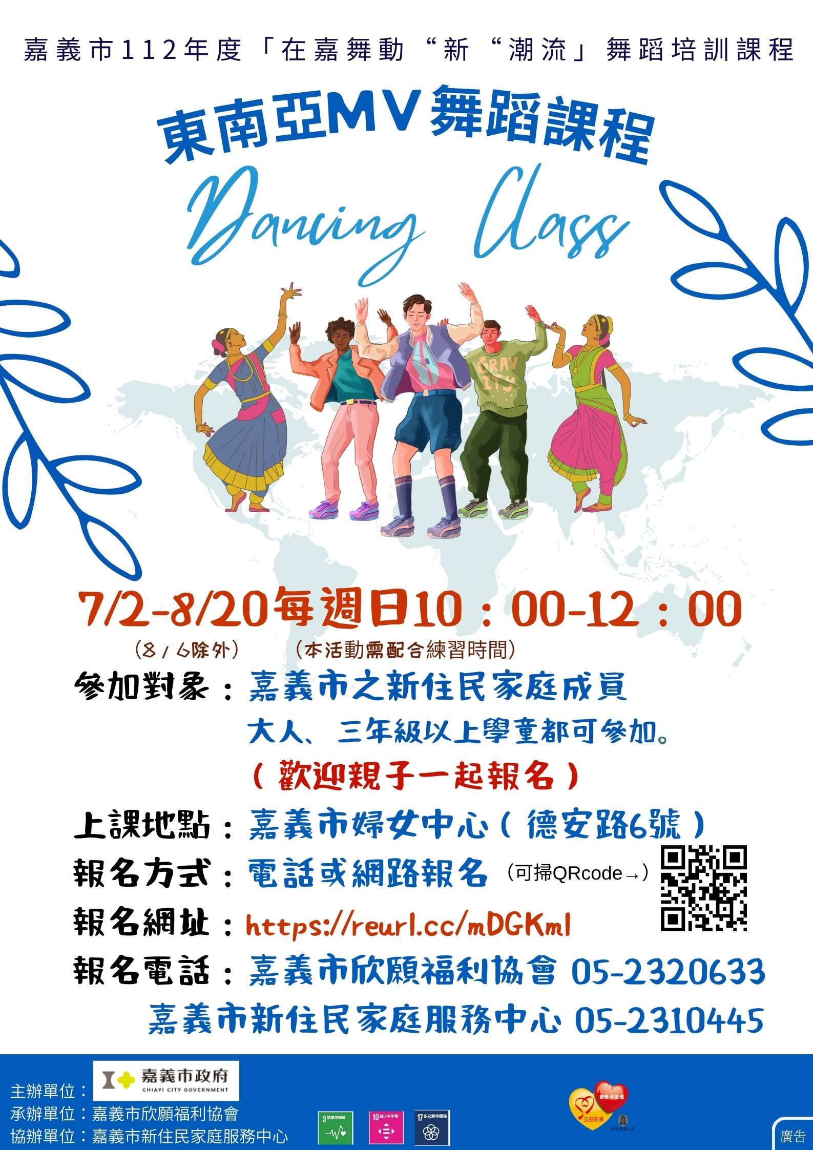 (一)嘉義市112年度「在嘉舞動“新“潮流」舞蹈培訓課程:活動訂於112年7月至8月,假嘉義市婦女福利服務中心辦理,以促進新住民家庭拓展社交,並藉由團體舞蹈表演培養團隊合作相互交流,提升良性之親子互動品質,激發潛能與創造生活自信心。
