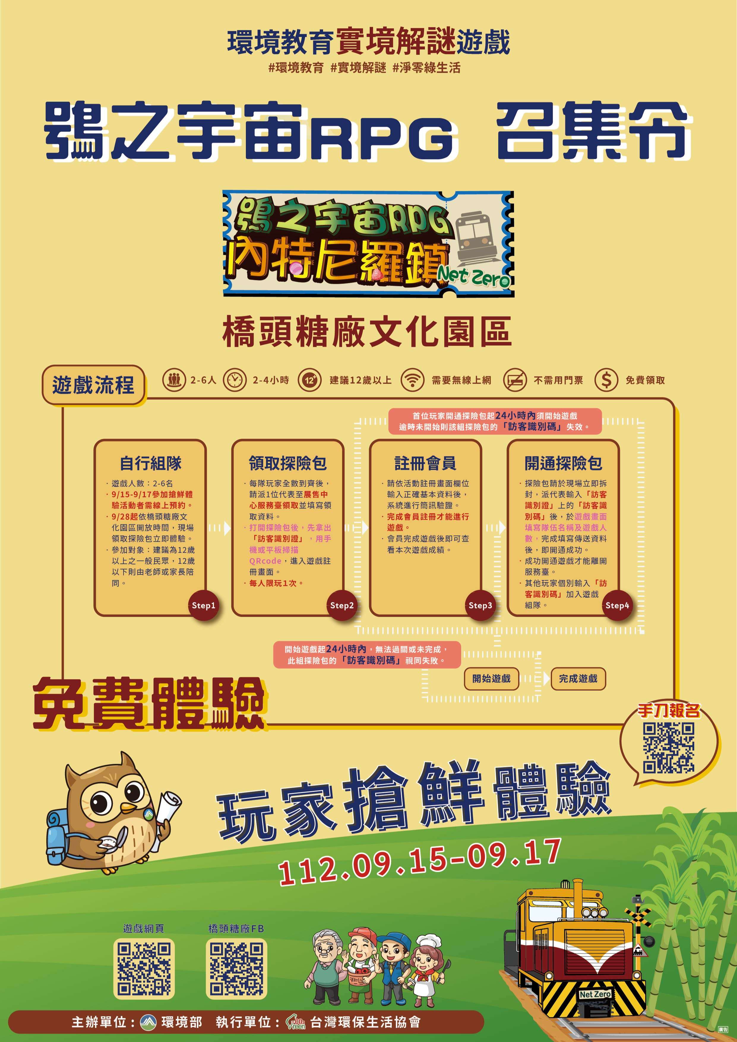 二、 為鼓勵民眾走出戶外,實際至環境教育特色場域認識環境,以設計實境解謎遊戲「鴞之宇宙RPG-內特尼羅(Net Zero)鎮環境教育實境解謎遊戲」,在實境解謎過程中學習綠生活知識,進而珍惜地球資源,落實保護環境行動。