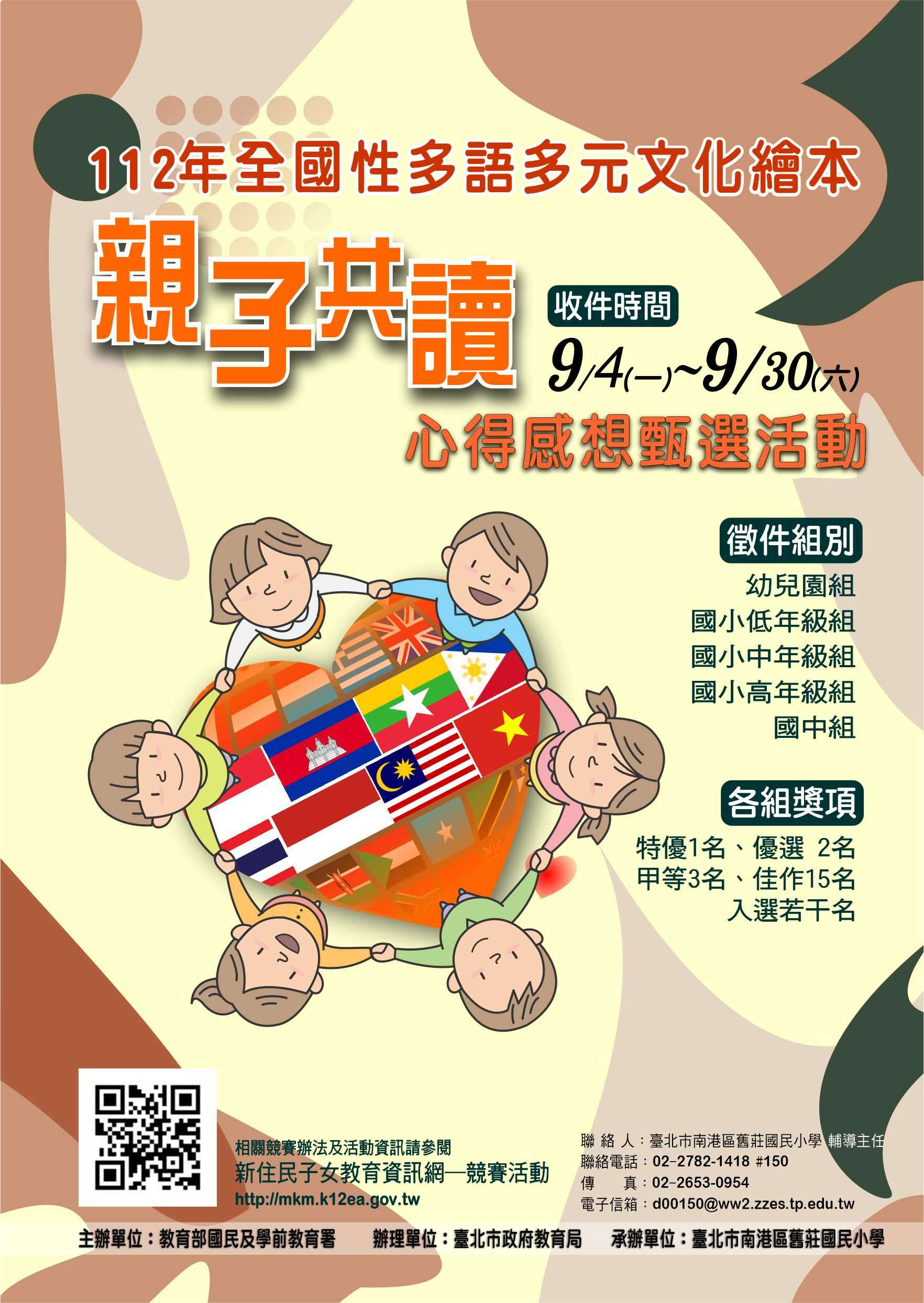 「112年度全國性多語多元文化繪本親子共讀心得感想甄選活動」收件時間自112年9月4日至9月30日止,請協助公告並踴躍報名參加,請查照。