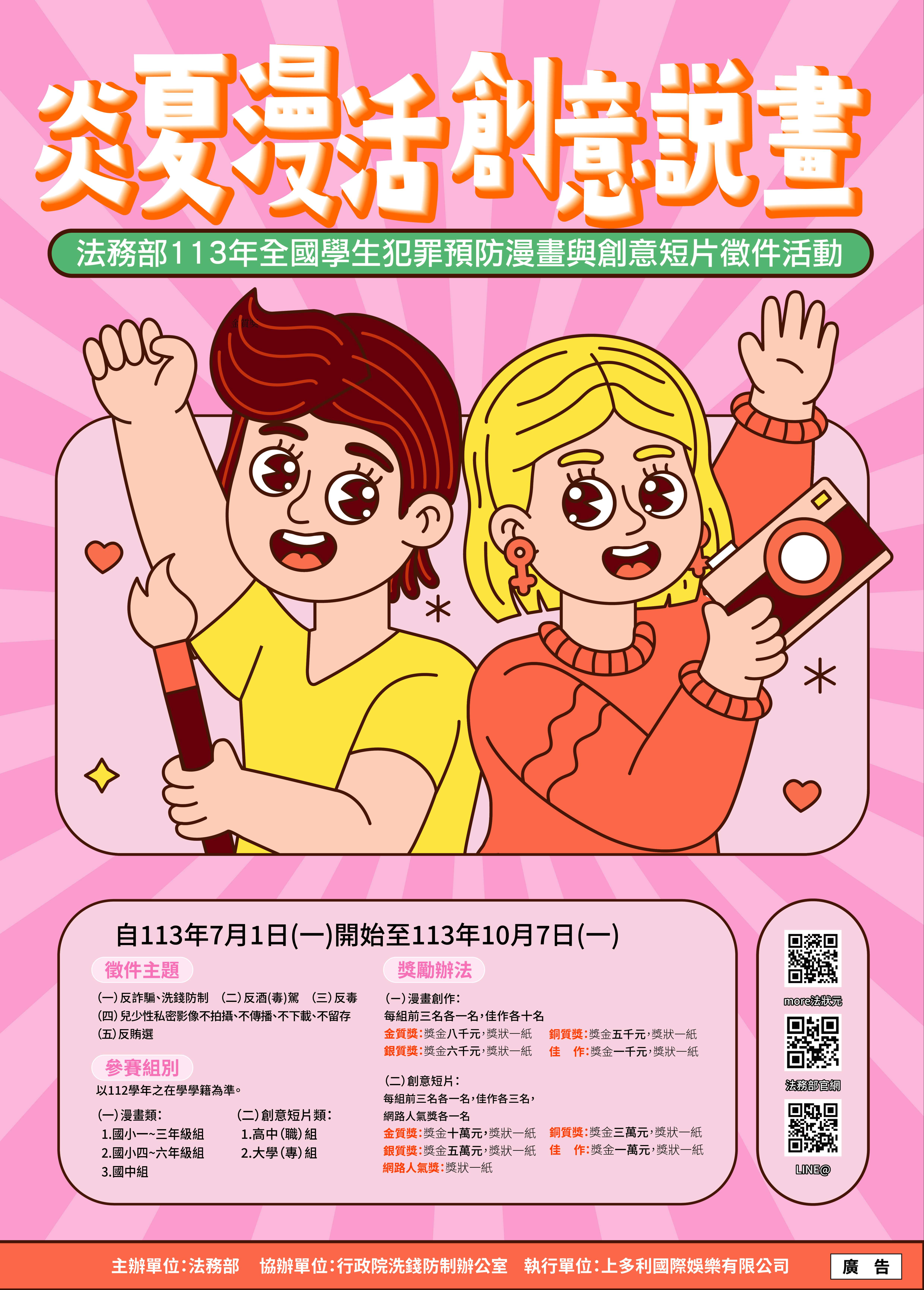 二、113年度漫畫組徵件對象為國中以下(含國中)學生,短片 組徵件對象為高中(職)及大學(專)在學學生。