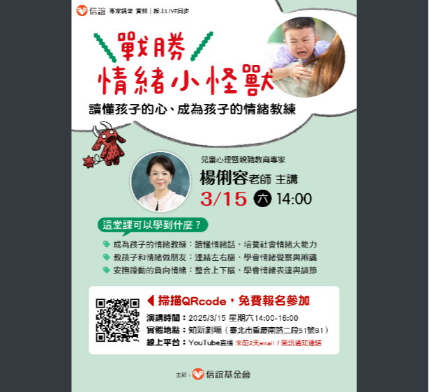 信誼基金會於3/15(六)舉辦【楊俐容老師主講/戰勝情緒小怪獸!讀懂孩子的心、成為孩子的情緒教練】親職講座,免費報名參加。