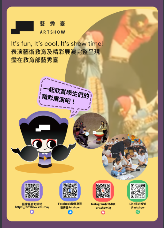 四、「藝秀臺」將持續提供優質展演及表演藝術教育推廣內 容,更多精采影片,請至「藝秀臺」網站,或至「藝秀 臺」臉書粉絲專頁:臉書搜尋「藝秀臺ArtShow」、官方 IG:搜尋「art.show.ig」關注即時訊息。