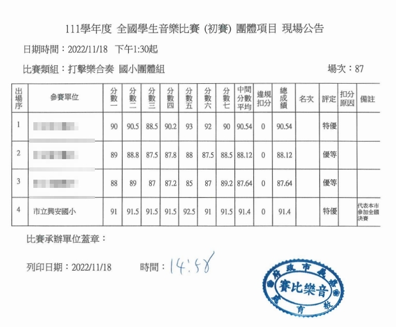 本校打擊樂合奏 特優第一 代表嘉義市參與全國賽