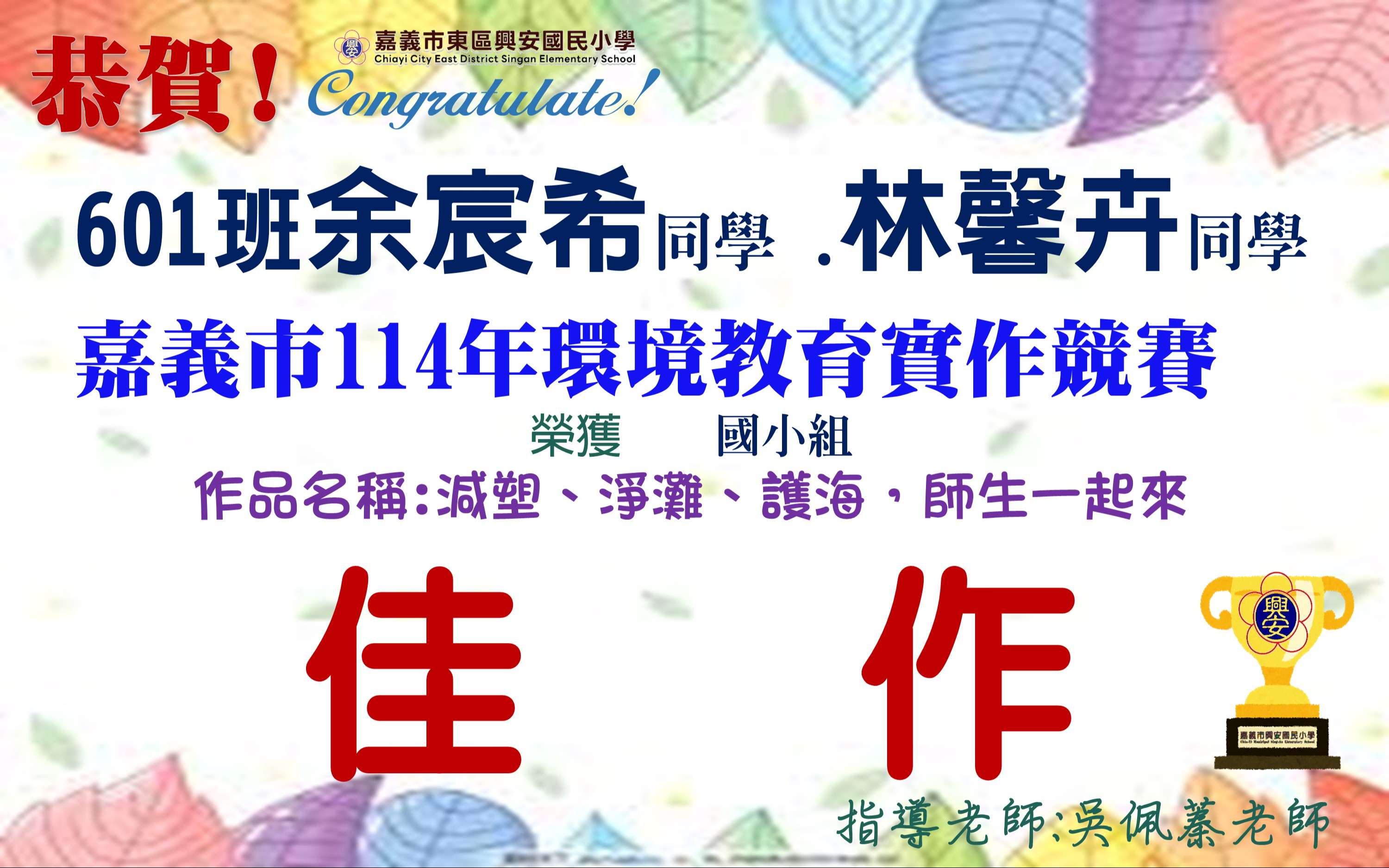 恭喜榮獲嘉義市114年環境教育實作競賽國小組佳作 作品名稱:減塑、淨灘、護海,師生一起來六年一班余宸希、林馨卉 指導老師:吳佩蓁老師
