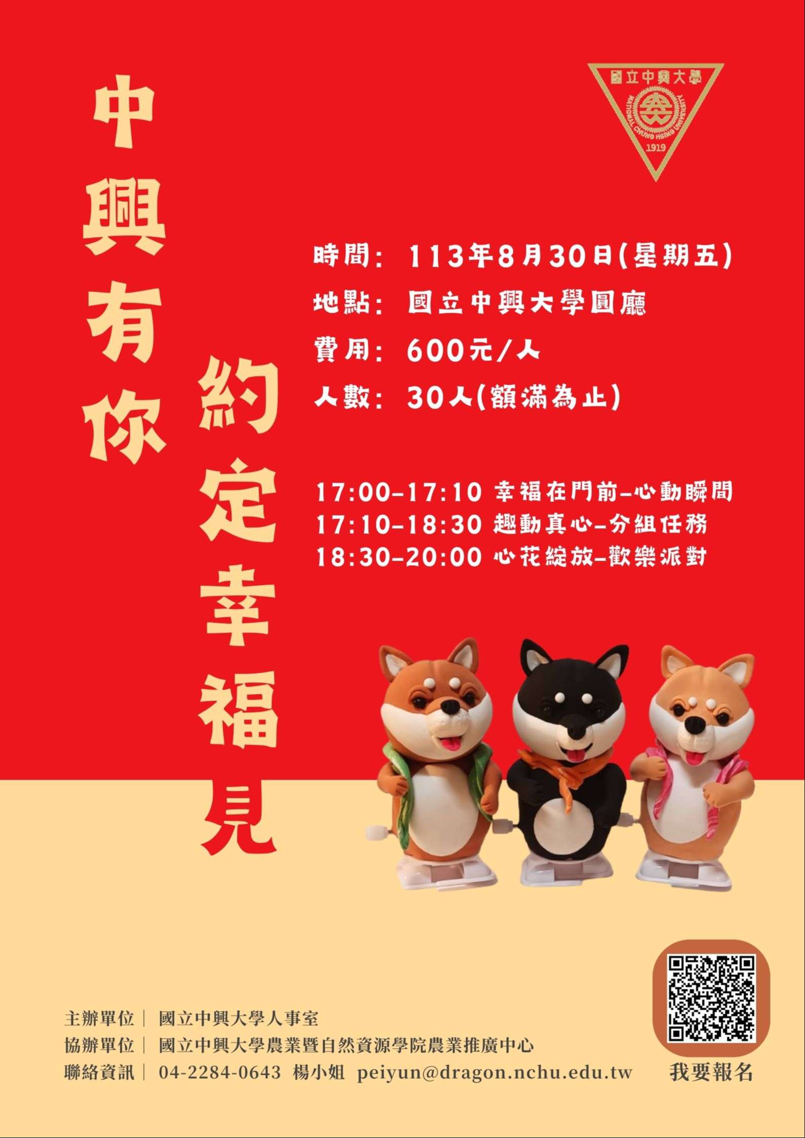 主旨:國立中興大學113年「中興有你,約定幸福見」單身聯誼活動實施計畫及活動海報各1份,請所屬符合資格之單身同仁踴躍報名參加,請查照。