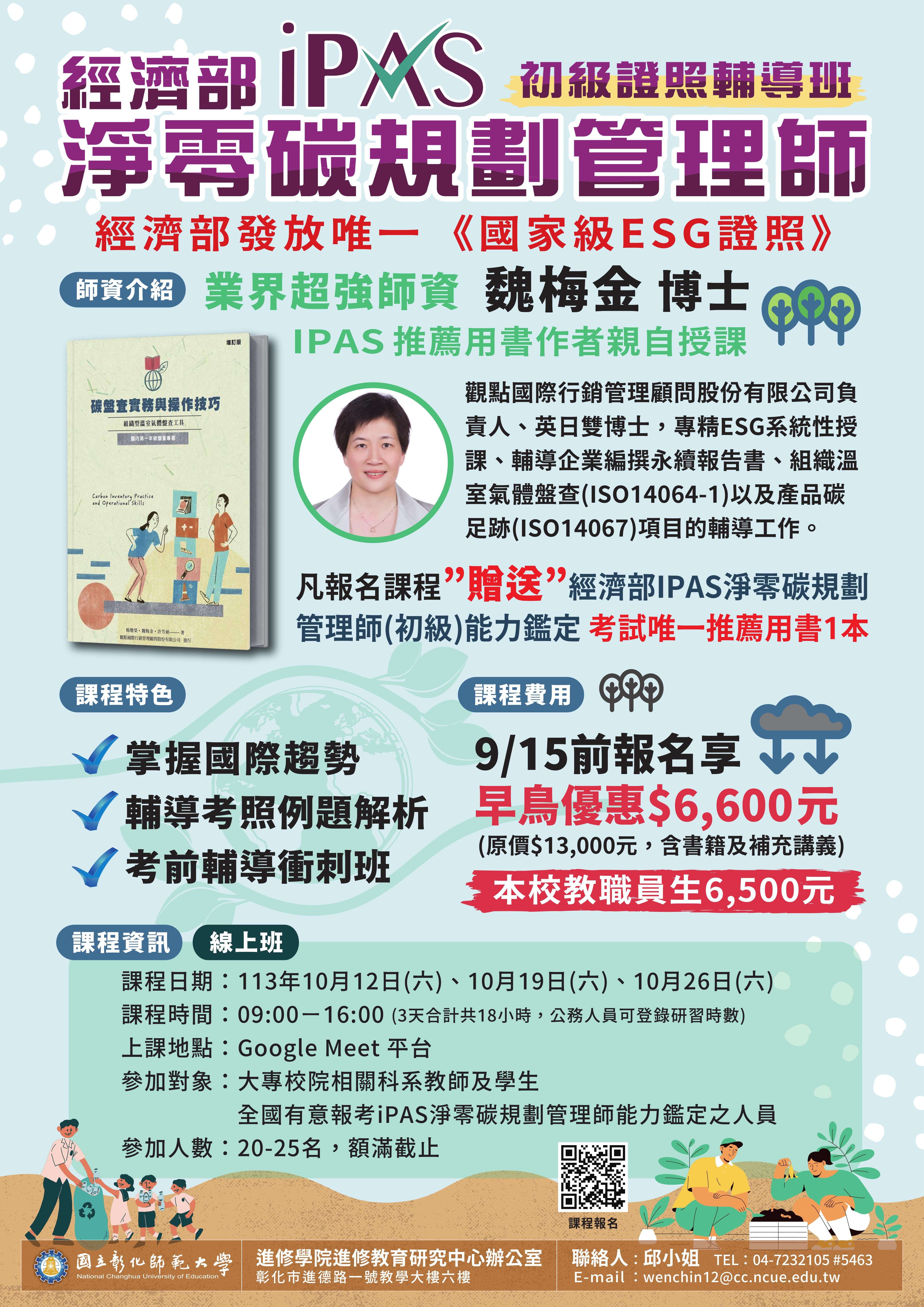 主旨:轉知國立彰化師範大學進修學院推廣教育「113年iPAS淨零碳規劃管理師(初級)能力鑑定輔導班 (線上班) 」招生簡章,請查照。