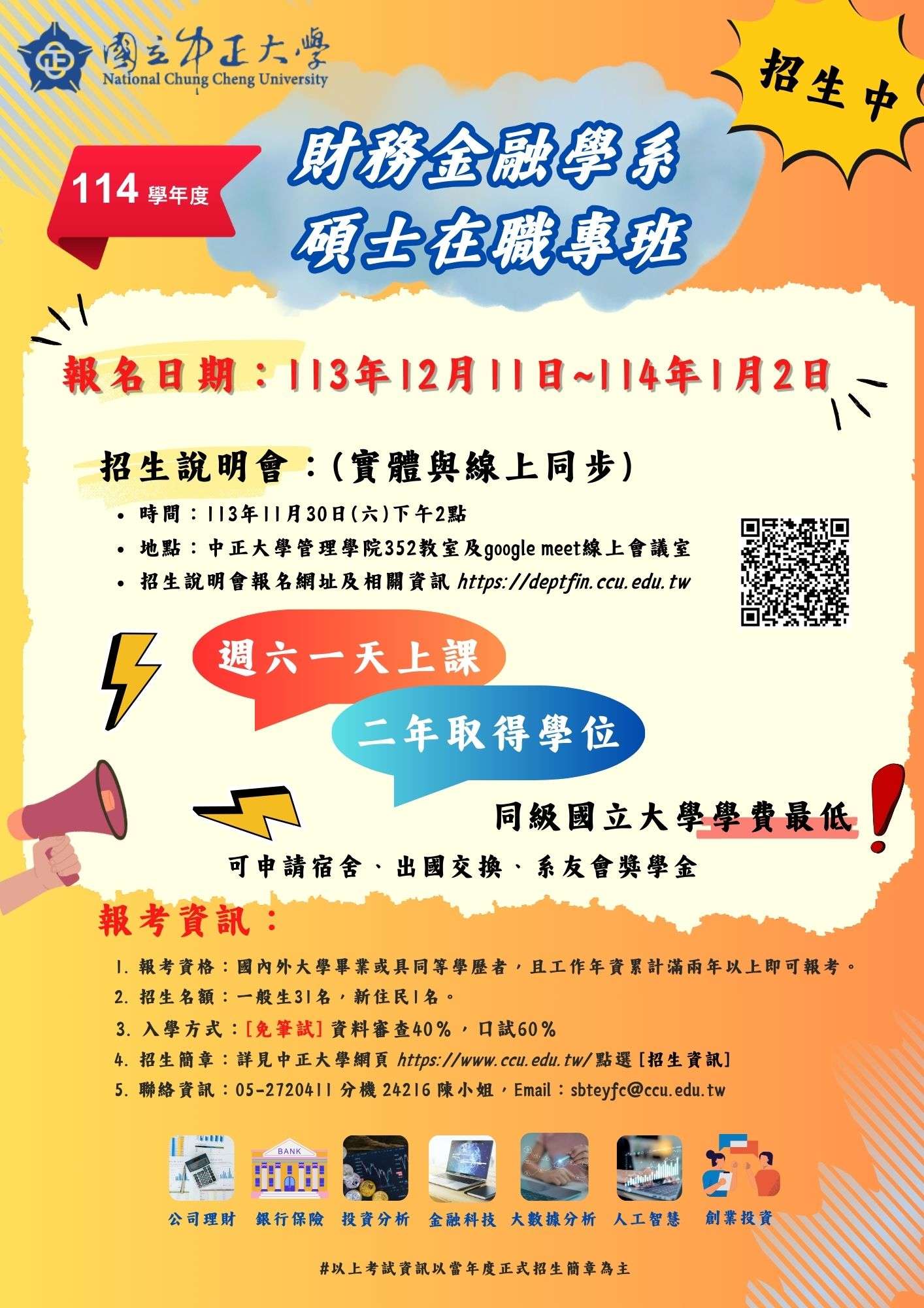 主旨:轉知國立中正大學財務金融學系碩士在職專班114學年度招生宣傳海報(詳如附件),請查照。