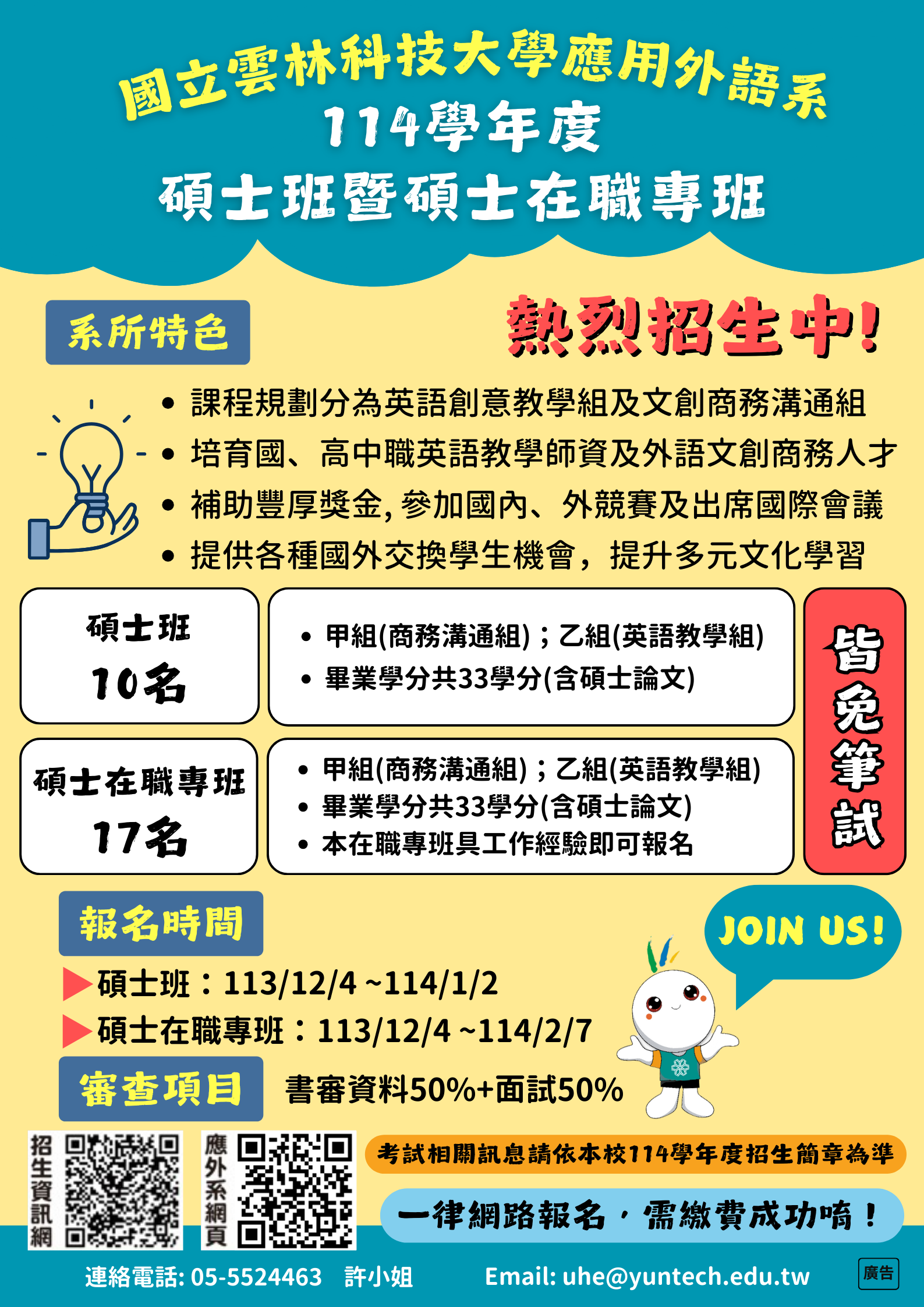 主旨:轉知國立雲林科技大學應用外語系114學年度碩士班暨在職專班招生資訊,請查照。