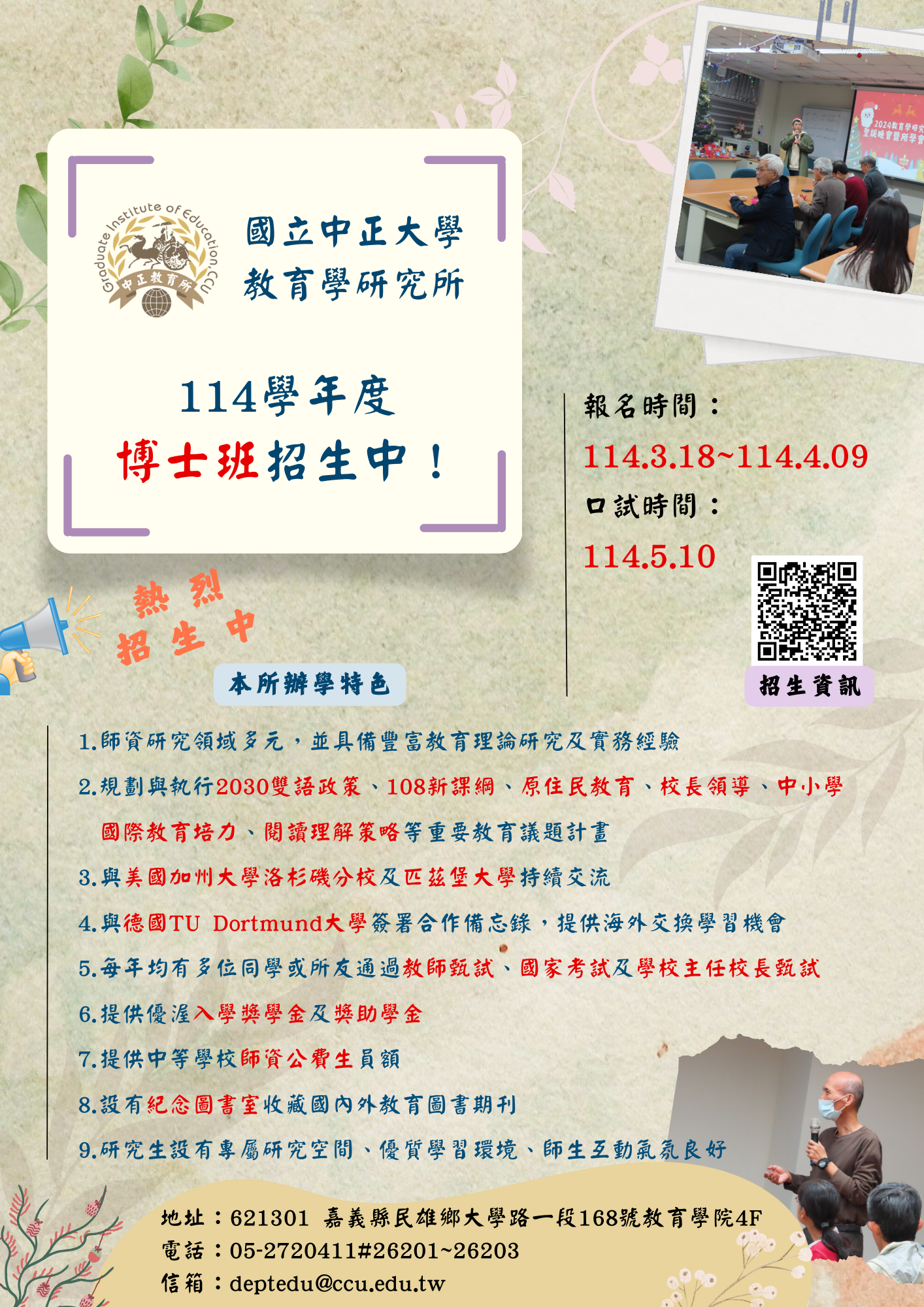 主旨:轉知國立中正大學教育學研究所114學年度博士班考試招生說明會及招生海報資訊,請查照。