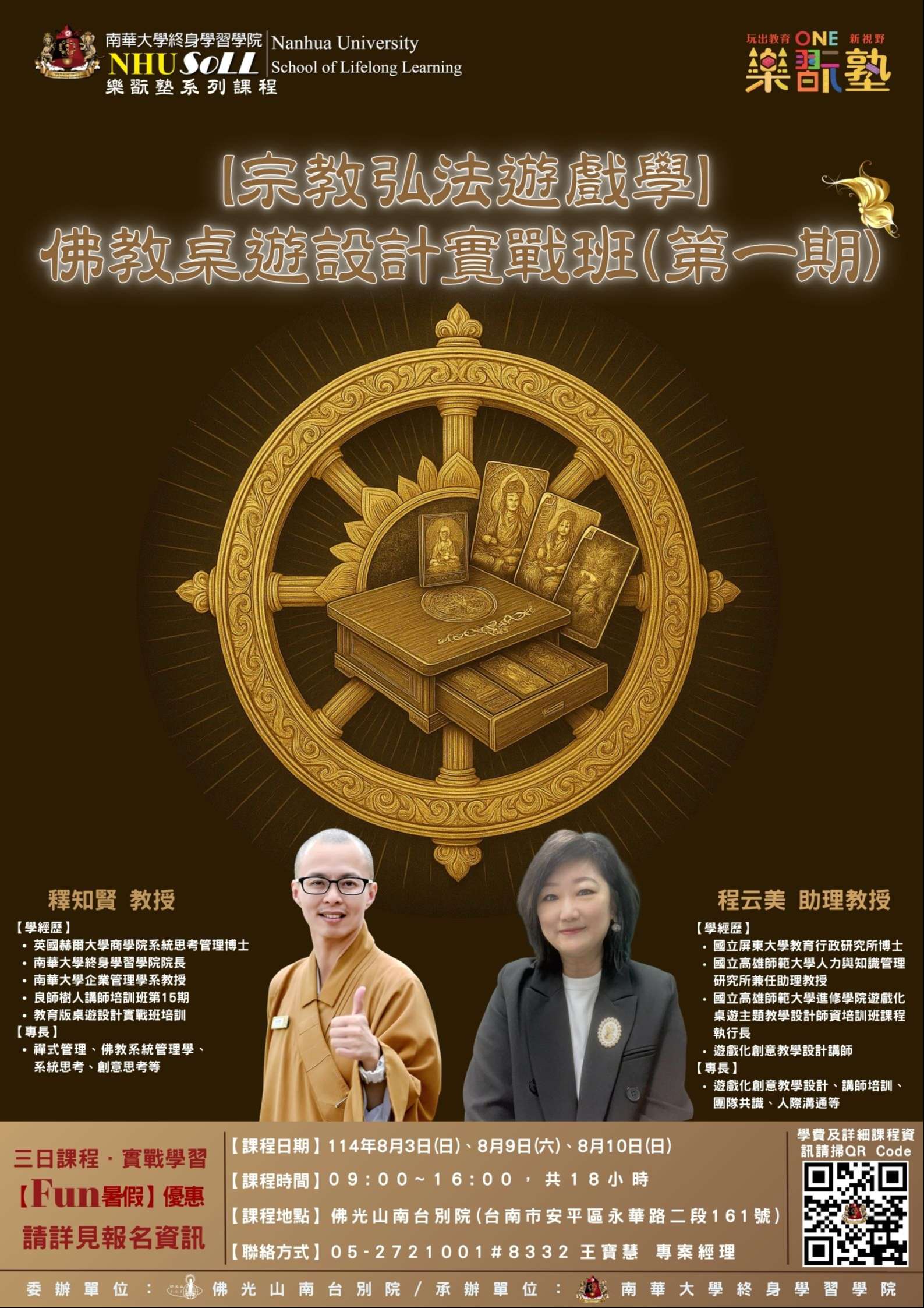 主旨:轉知南華大學114年8月份開辦之【宗教弘法遊戲學】佛教桌遊設計實戰班(第一期)課程資訊,請查照。