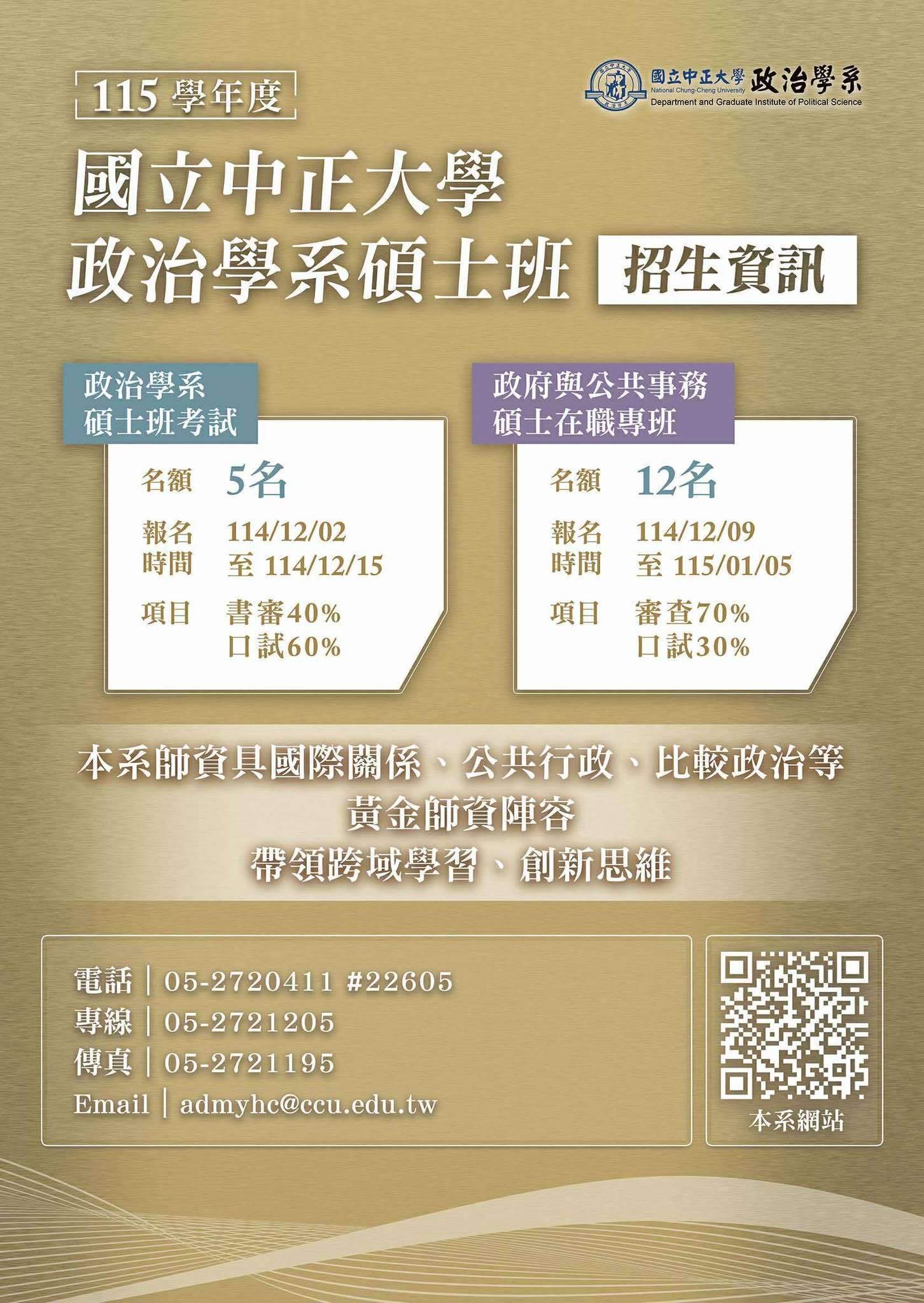 主旨:轉知國立中正大學政治學系115學年度政府與公共事務碩士在職專班招生考試資訊,報名日期自114年12月9日起至115年1月5日止,請查照。